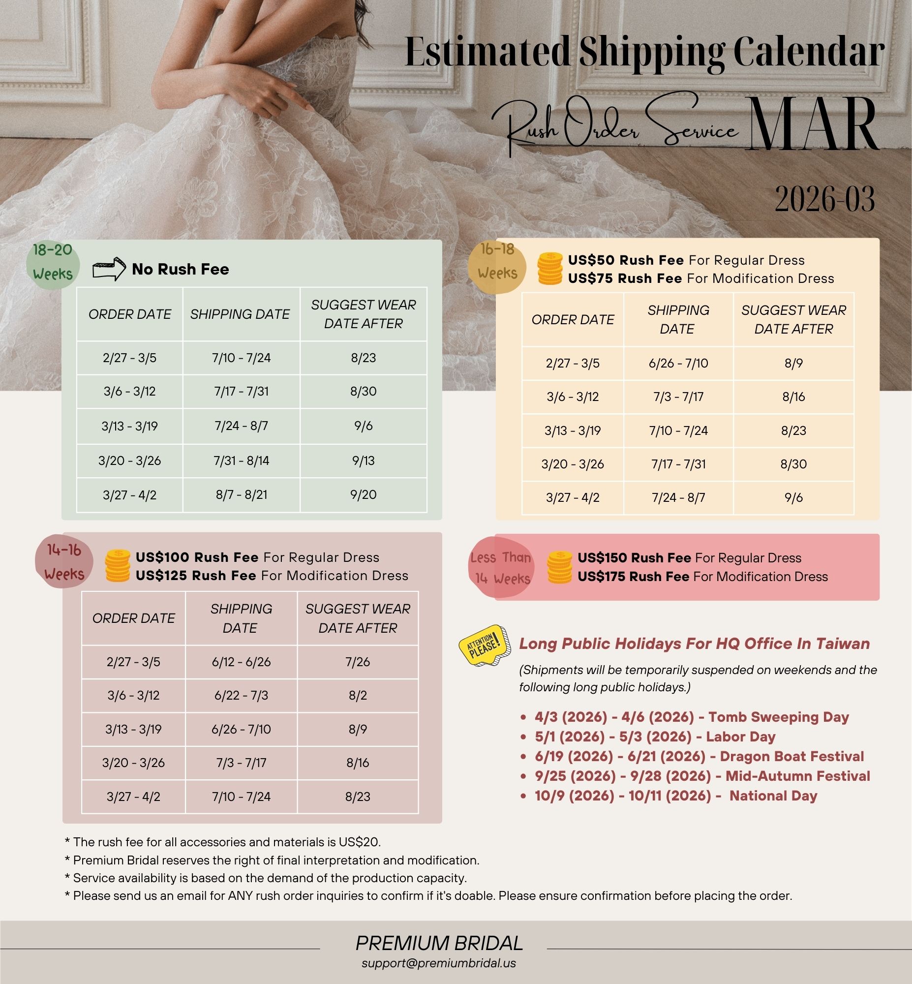 Please send us an email at support@premiumbridal.us for ANY rush order inquiries to confirm if it’s doable. Please ensure confirmation before placing the order.